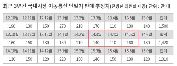 지난해 10월 단통법 시행 이후 6월 현재까지 휴대전화 판매량은 8% 줄어들었다. 1년 전 같은 기간(2013년 10월에서 2014년 6월까지) 1420대가 팔린 데 비해 단통법 이후엔 1310대가 판매됐다.
