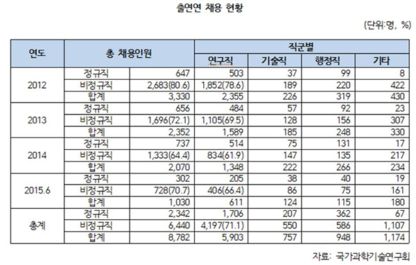 최근 4년간 정부 출연 연구기관(출연연)이 연구직 인력을 뽑을 때 10명 중 7명 꼴로 비정규직을 채용한 것으로 나타났다. 9일 국회 미래창조과학방송통신위원회 소속 조해진 새누리당 의원은 국가과학기술연구회 자료를 분석한 결과 2012년부터 지난 6월까지 신규 연구직 채용인력은 5903명이며, 이 중 71.1%인 4197명이 비정규직이라고 밝혔다.
