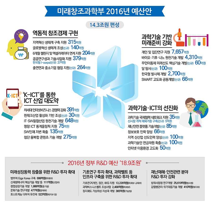 민원기 미래부 기획조정실장은 “과학기술과 ICT를 통해 미래에 대비하며 신산업을 창출하는 기반을 구축하는데 중점 투자할 방침”이라고 말했다.