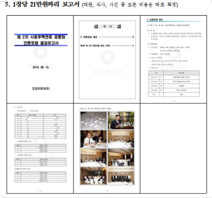 자료에 따르면 해당 보고서는 대부분 언론기사 스크랩 위주다. 특히 표지·목차·개요· 참석자명단·행사사진(비용별도)의 5장짜리 보고서에 105만원이 지출된 것으로 나타났다. 1장당 21만원 꼴이다.