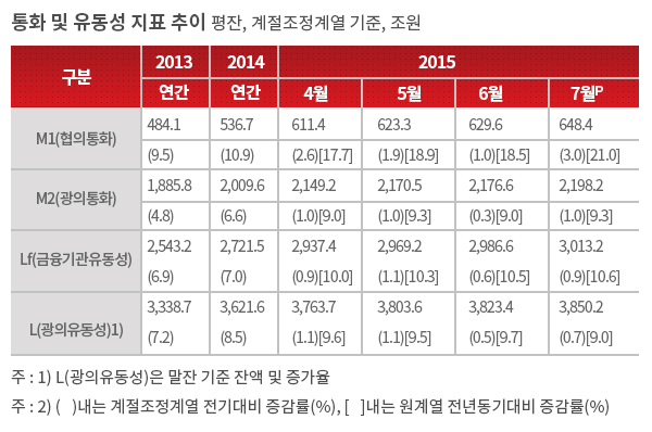한국은행이 10일 발표한 2015년 7월 중 통화 및 유동성 자료에 따르면 협의통화인 M1(평잔)은 전월 대비 3.0% 증가했다. 전년 동월 대비론 21.0% 늘었다.