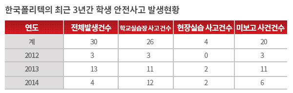 지난 3년간 폴리텍에서 일어난 산재사고는 현장실습 산재사고 4건, 교내 실습장 사고 26건 등 총30건이다. 폴리텍은 이 중 20건을 관계당국에 보고하지 않았다.