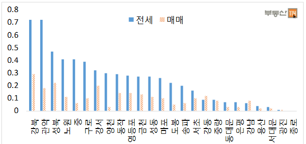 자치구 별로는 강북구가 0.29% 올라 가장 높은 상승률을 기록했고, 성북(0.22%), 강서(0.20%), 관악(0.18%)이 그 뒤를 이었다.