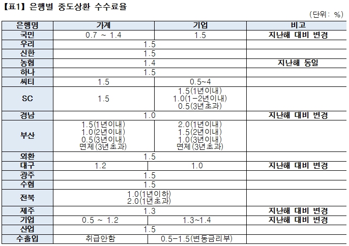 유 의원은 "금융위와 금감원은 지난 2013년 5월 중도상환수수료 관련 TF(task force)를 꾸리고 수수료율 인하료율 인하를 유도하겠다고 밝혔지만 실효성이 없다"고 말했다. KB국민·기업·경남·대구·제주은행 등 5곳만이 수수료율 인하했다.
