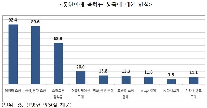 국회 미래창조과학방송통신위원회 소속 전병헌 의원(서울 동작 갑)은 소비자들이 휴대폰 할부금 등 기타 요금을 모두 통신사용요금으로 오해하는 경우가 많다고 13일 전했다. 이는 전병헌 의원이 녹색 소비자 연대와 공동으로 응답자 1000명 대상 설문조사를 진행한 결과에 따른 것이다.