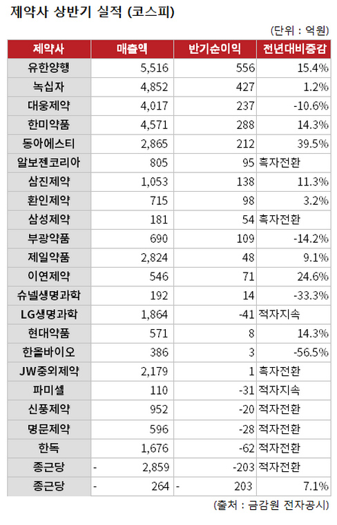 주요 제약업체 중 2분기 순이익이 가장 큰 곳은 유한양행으로 309억원을 기록했다. 녹십자는 295억원, 대웅제약과 한미약품은 나란히 126억원의 순이익을 냈다.