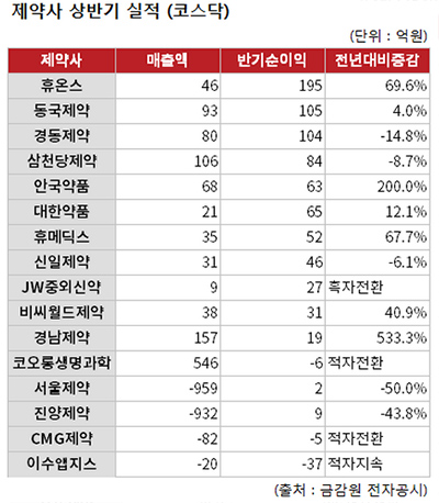 상반기 업종별 수익성 지표에서 코스닥 바이오 업종은 영업이익이 21.6% 증가했다. 업종 순이익은 18.7% 늘었다. 코스피 제약사들은 다른 업종과 비슷한 수준의 상승률을 보였다. 제약 업종 평균으로는 납득할만한 수준의 실적을 냈다.