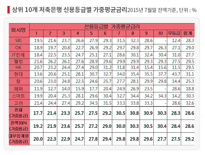특히 대부업 계열 저축은행의 평균 대출금리는 29.2%에 달했다. OK저축은행(29%)과 웰컴저축은행( 29.5%) 등이 높은 금리를 적용하고 있다.