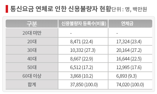 19~39세의 통신요금 연체액이 전체의 45%를 차지했다. 미성년 연체자도 14만3000여명에 달했다.