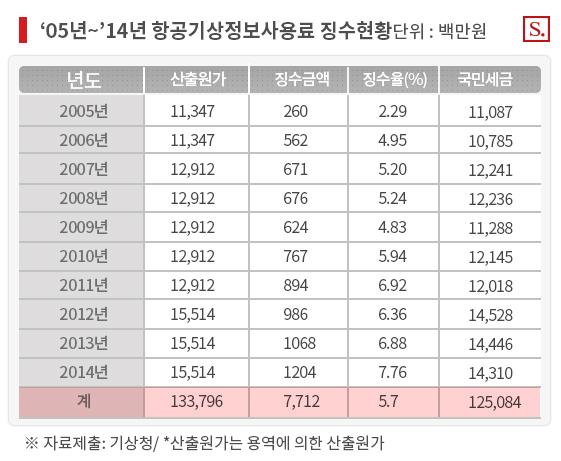 14일 국회 환경노동위원회 소속 양창영 의원이 기상청으로부터 제출 받은 ‘2005~2014년 항공기상정보사용료 징수현황’에 따르면, 지난 10년 동안 항공기상정보 산출원가 추정치 1337억 9600만원 중 징수액은 77억1200만원(5.7%)에 불과했다. 1250억8400만원은 국민세금으로 메웠다.