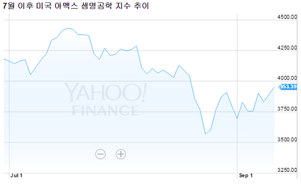 현지시각으로 지난 11일 미국 아멕스 생명공학지수는 3953.39를 기록했다. 9월 첫 거래일 기록한 3696.13에 비해 6.9% 상승한 수치다.