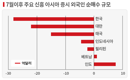지난 7월부터 8월 초까지 대부분 신흥국에서 외국인 자금이 대거 이탈했다. 중국 증시는 폭락했지만 인도에는 자금이 오히려 유입됐다.