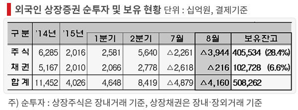 15일 금융감독원(원장 진웅섭)에 따르면 8월 중 외국인은 상장주식 3조9000억원을 순매도했다.