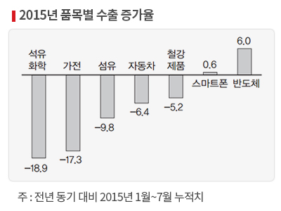 세계적인 경제 성장 정체 속에 우리나라 수출도 모멘텀을 찾기 어려울 전망이다. LG경제연구원은 석유화학, 철강 등 소재부문은 세계적인 공급과잉으로 단가하락이 심화될 것으로 예상했다. 조선업과 자동차 수출도 수요 부진 속에 미래가 어둡다. 다만 반도체 분야는 수요 확대와 기술적 경쟁 우위가 유지돼 성장 추세를 보일 것으로 예상했다.