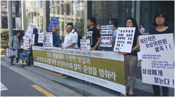15일 오후1시쯤 서울 서초구 서초동 소재 삼성그룹 사옥 앞에서 범노동인권시민단체와 삼성 직업병 피해자 가족들이 모여 삼성을 규탄하는 기자회견을 열었다. 이들은 삼성 측이 조정위원회의 권고안을 무시하고 피해자들에게 개별 연락한 것에 대해 항의했다. 삼성이 보상위원회를 독자적으로 구성한 진의에 대해서도 따졌다.