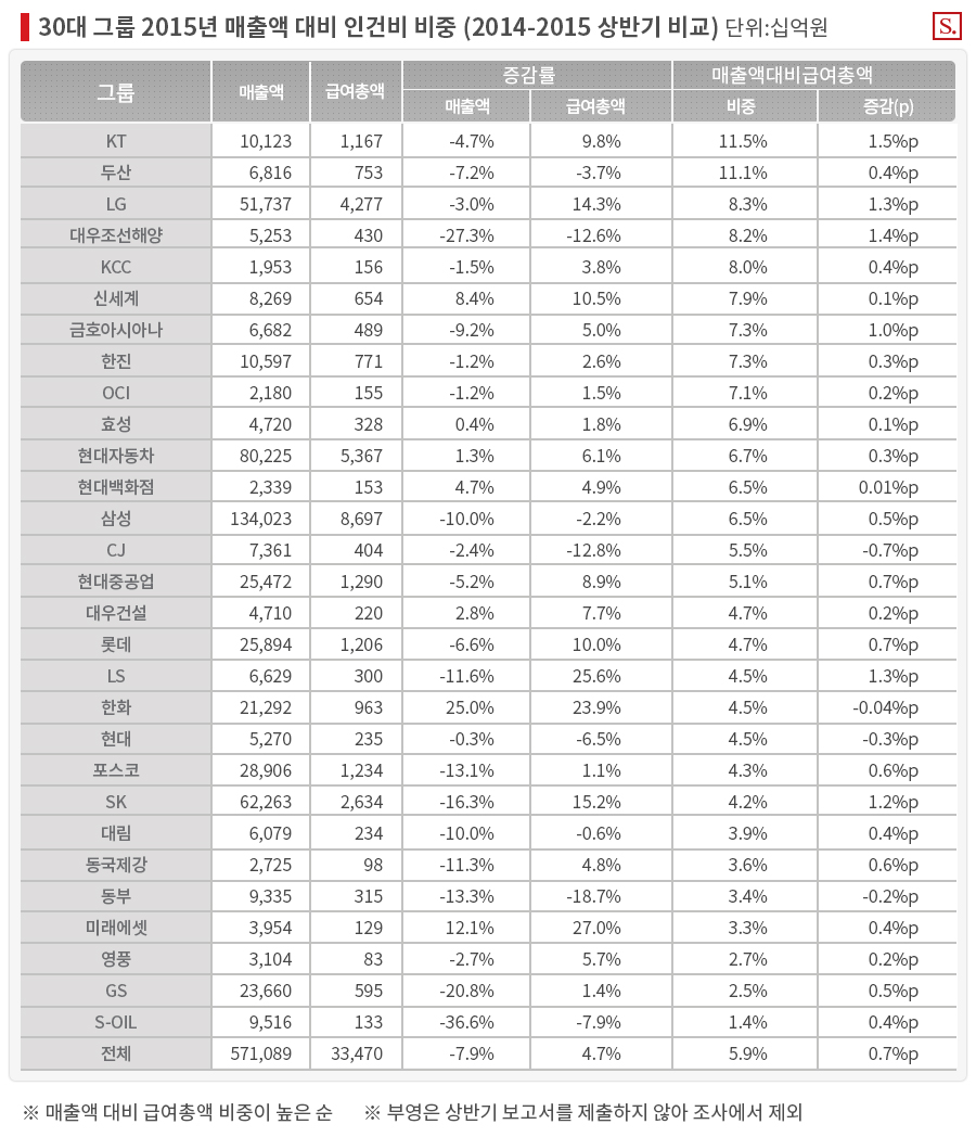 SK(4.2%), 포스코(4.3%), 현대·한화·LS(각 4.5%), 롯데·대우건설(각 4.7%)은 4%대, 현대중공업(5.1%), CJ(5.5%)는 5%대였다. 미래에셋(3.3%), 동부(3.4%), 동국제강(3.6%), 대림(3.9%)은 3%대였다. GS(2.5%), 영풍(2.7%)도 3%를 넘지 않았다. S-OIL은 인건비 비중이 1.4%로 가장 낮았다.LG(8.3%), 대우조선해양(8.2%), KCC(8.0%)의 경우 인건비 비중이 8%를 넘었다. 신세계(7.9%), 한진·금호아시아나(각 7.3%), OCI(7.1%), 효성(6.9%), 현대자동차(6.7%), 현대백화점·삼성(각 6.5%) 등도 30대 그룹 평균치인 5.9%를 상회했다.