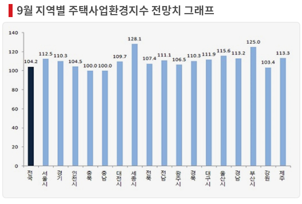 주택사업환경지수 최고치는 세종(128.1·11.5포인트↑)이며 동시에 전월대비 상승폭도 가장 컸다. 전월 대비 최고 하락 지역은 광주(106.5·19.4포인트↓)로 나타났다.