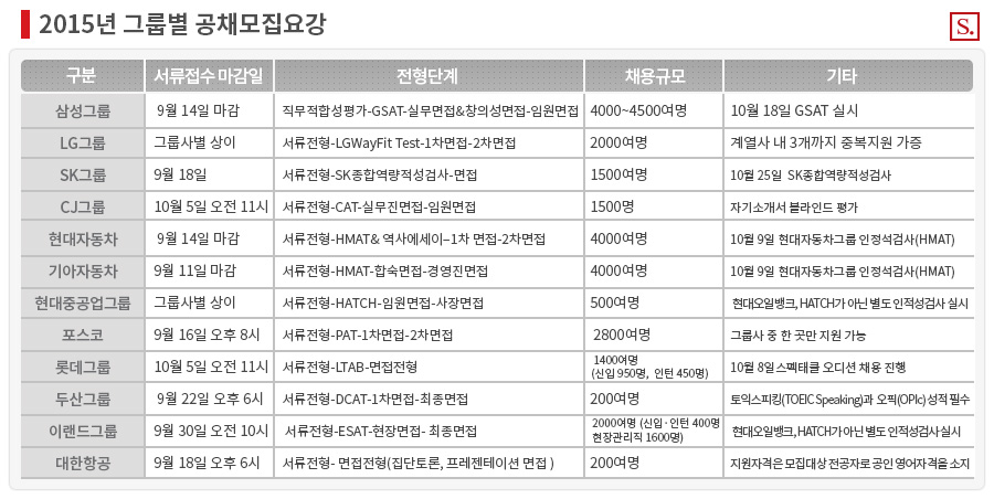 2015년 하반기 신입사원 공채가 본격화 했다. 삼성그룹를 필두로 LG그룹, SK그룹 등 대기업들이 신입사원 공채에 나선다. 주요 그룹은 정부와의 약속에 따라 올해 하반기 대졸 공채를 늘릴 계획이다.