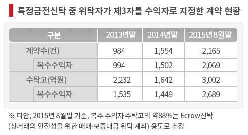 자료에 따른면 복수 수익자를 내세운 타익신탁 상품의 수탁잔고는 2014년말 1449억원에서 올해 8월 2689억원으로 증가했다.