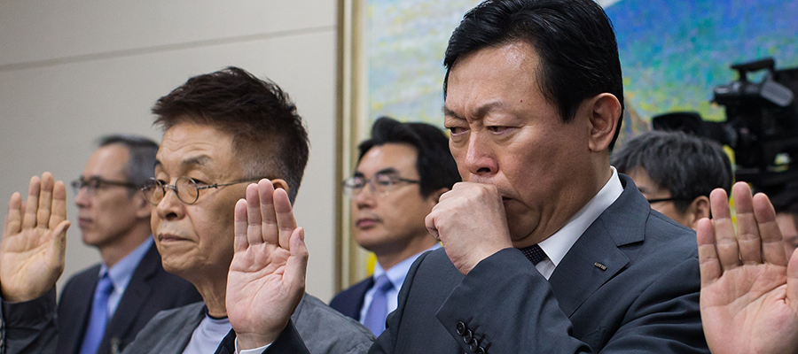 신동빈 회장은 신동주 전 일본롯데홀딩스 부회장과의 경영권 분쟁을 관련한 입장을 묻자 자리에서 일어나 "가족간의 일로 국민에게 심려 끼쳐드린 점 부끄럽게 생각하고 진심으로 사과드린다"며 고개를 숙였다.