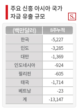 국제금융센터에 따르면 지난 8주 동안 한국 주식 자금 유출 규모는52억2700만달러(약 6조988억원)로 아시아 신흥국(한국, 인도, 대만, 인도네시아, 필리핀, 태국, 베트남 등 7국 기준) 중 1위를 기록했다. 아시아 신흥국 총 유출액의 40%나 되는 규모다.