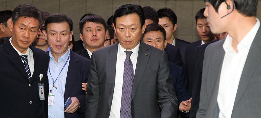 17일 오후 1시50분. 국회 본관 앞에 수십여 명의 취재진이 몰려있는 가운데 짙은 회색 계열 정장에 보라색 타이를 멘 신동빈 롯데그룹 회장이 들어섰다. 일반 방문자와 마찬가지로 신분증을 내고 출입증을 받은 신 회장은 다소 긴장한 듯한 표정으로 국정감사장에 들어섰다.