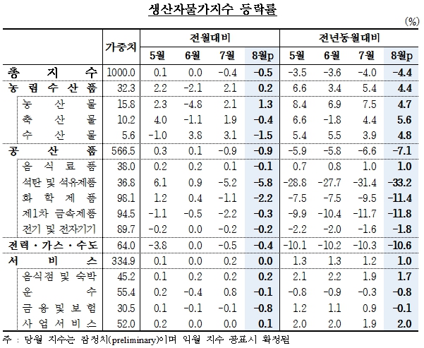 한국은행은 18일 올 8월 생산자물가지수가 전월 대비 0.5% 하락했다고 밝혔다. 전년 동월 대비로는 4.4% 떨어졌다.