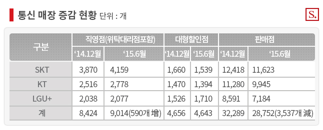 국회 미래창조과학방송통신위원회 소속 유승희 새정치민주연합 의원에 따르면 통신 3사 직영점은 2014년 12월 8424개에서 2015년 6월 현재 9014개로 590(7%)개 늘었다. 같은 기간 영세 대리점은 3만2289개에서 3537(11%)개 줄어든 2만8752개로 나타났다.