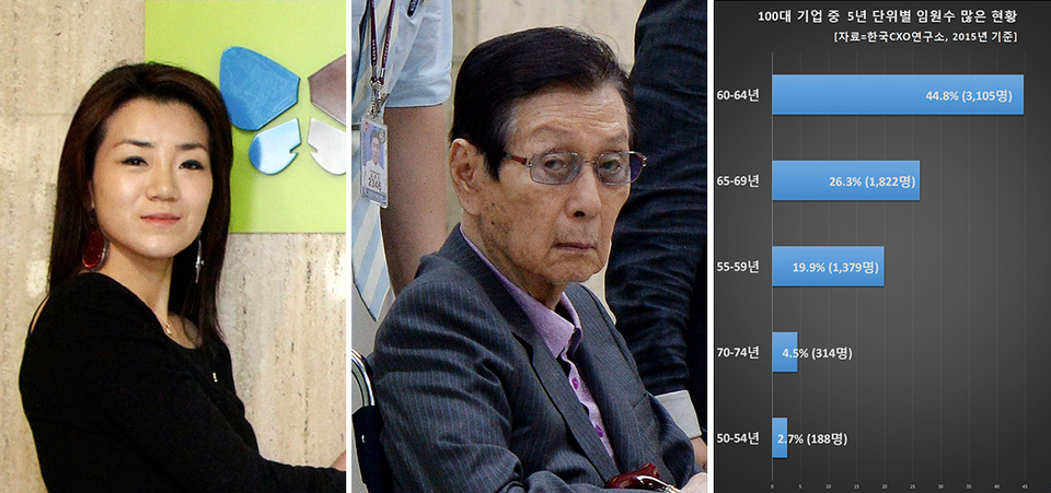 등기 임원과 미등기 임원을 통틀어 100대 기업 중 최고령 임원은 신격호 롯데 회장이다. 신격호 회장은 1922년생으로 올해 94세다. 이인희 한솔제지 고문(1929년생), 신춘호 농심회장(1932년생), 손복남 CJ제일제당 고문(1933년생), 조석래 효성 회장 (1935년생)이 그 뒤를 이었다.