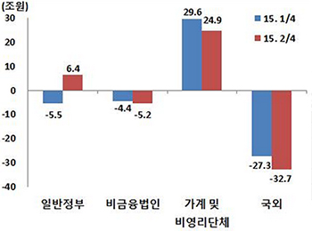 국외 부문은 경상수지 흑자가 늘어나면서 자금부족 규모가 1분기 27조3000억원에서 2분기 32조7000억원으로 확대됐다.