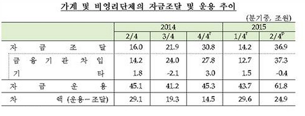 23일 한국은행이 발표한 '2015년 2분기 중 자금 순환' 자료를 보면 올 2분기(4∼6월) 가계 및 비영리단체의 자금잉여 규모는 24조9000억원으로 1분기(1∼3월)의 29조6000억원에 비해 4조7000억원 줄어들었다.