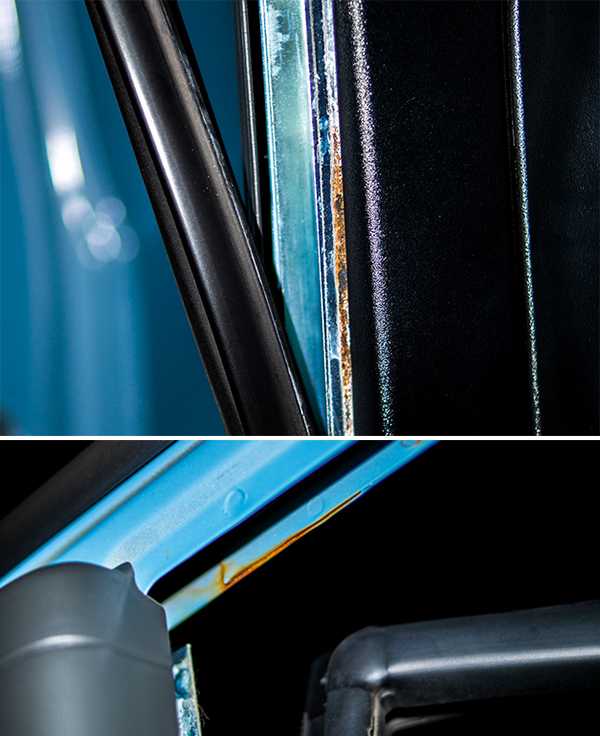 녹이 슨 부위는 왼쪽 뒷문 창틀이다. 몰딩 안쪽과 도어 캐치(문이 열리고 닫히게 하는 장치) 주변이 붉게 변했다.