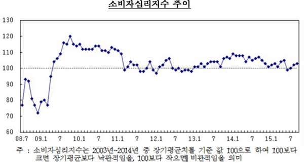 소비자심리지수는 소비자동향지수(CSI) 중 현재 생활형편, 생활형편 전망, 가계수입 전망, 소비지출 전망, 현재 경기판단, 향후 경기전망 등 6개 주요지수를 이용해 산출한 심리지표다. 100 이상이면 과거 평균치(2003~2014년)보다 낙관적으로, 100 이하이면 비관적으로 보는 소비자가 많다는 뜻이다.