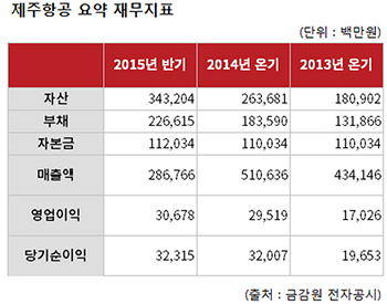 업계에서 경쟁력을 가진 점도 고무적이다. 제주항공의 올 상반기 매출액은 2867억원으로 지난해 같은 기간의 2354억원에 비해 21.8% 늘었다. 메르스 여파로 기존 대형항공사들의 실적이 악화된 것과 대조적이다.
