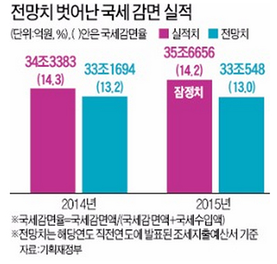 그러나 기획재정부는 지난 11일 국회에 '2016년도 조세지출예산서'를 제출하며 올해 국세감면액을 35조6656억원으로 추산했다. 올해 국세감면액을 33조548억원으로 전망했던 것과 비교하면 2조6000억원 이상 늘어난 것이다. 지난해 국세감면액은 당초 33조원 수준으로 예상했지만 결국 34조3383억원의 세금을 깎아줬다. 임기 첫 해인 2013년의 국세감면액 33조8350억원보다 오히려 늘어난 것이다. 사실상 공약가계부의 18조원 세수 확충 방안은 사라진 셈이다.