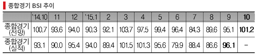 전국경제인연합회는 매출액 기준 600대 기업을 대상으로 실시한 기업경기실사지수(BSI) 조사 결과, 10월 종합경기 전망치는 101.2를 기록했다고 29일 밝혔다. 종합경기 전망치가 기준치인 100을 넘기는 지난 3월 이후 7개월만이다.