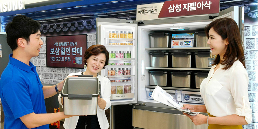 10월부터 2016년 형 ‘지펠아삭’을 사는 고객이 구형 김치냉장고를 반납하면 15만원을 받는다. 추첨에 뽑힌 30명은 명인에게 김장 강습도 체험한다. 삼성전자는 김장철을 맞아 11월 1일까지 ‘김치냉장고 고객사랑 대축제’를 연다고 밝혔다.
