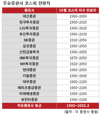 30일 시사저널 경제매체 시사비즈가 주요 증권사 전망을 종합한 결과 10월 코스피는 1900에서 2055 사이에서 움직일 것으로 예상된다. 국내 증시가 8월 급락 이후 회복이 더딘 상황이고 외국인 매도세는 다시 길어지는 분위기를 반영한 결과다.