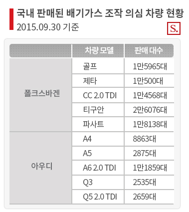 아우디폴크스바겐 코리아는 1일 미국 환경보호국(EPA)과 캘리포니아 대기자원위원회(CARB)에서 배기가스 배출량 불일치로 지적한 EA189 디젤 엔진(배기량 1.6/2.0 TDI)을 장착한 국내 판매차량 내역을 공개했다.