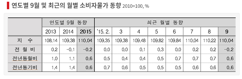 통계청이 2일 발표한 ‘소비자물가동향’에 따르면 9월 소비자물가지수는 110.04로 8월보다 0.2% 하락했고 지난해 같은 달보다 0.6% 상승했다.