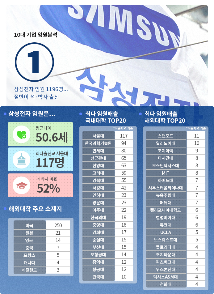 삼성전자 임원 중 석·박사 출신인 619명(석사 343명, 박사 276명)이다. 임원 2명 중 1명이 석사 이상 학력 소유자로 가방끈이 긴 편이다. 연구 개발을 중시 여기는 사내 풍토가 만들어 낸 수치다.
