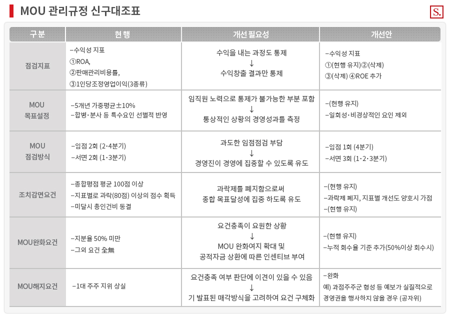 당국이 발표한 MOU 개선 방향은 일반 시중은행 건전성·수익성 점검과 다름없는 수준으로 MOU관리체계를 개선하는 것을 원칙으로 한다. 관련 지표는 총자기자본비율(자기자본/총자산), 총자산순이익률(ROA·당기순이익/총자산), 이익경비율(CIR·판매관리비/영업이익), 고정이하여신비율(고정이하여신/총여신), 예대율(대출금 잔액/예금 잔액) 등이다.