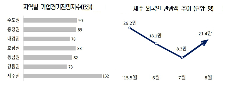 메르스 사태로 지난 7월 제주도 관광객은 20만명 이상 감소했다. 하지만 지난 8월 21만명 이상으로 늘면서 제주 경기가 활기를 되찾았다. 상반기에 연기됐던 행사도 개최되면서 식음료 등 소비재 산업을 중심으로 경기가 회복했다.
