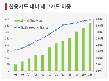 신용카드를 통한 가맹점 결제액(일시불+할부) 대비 체크카드 이용액 비중 역시 지난 2005년 4.9%에서 올해 33% 수준으로 성장할 것으로 예상됐다.