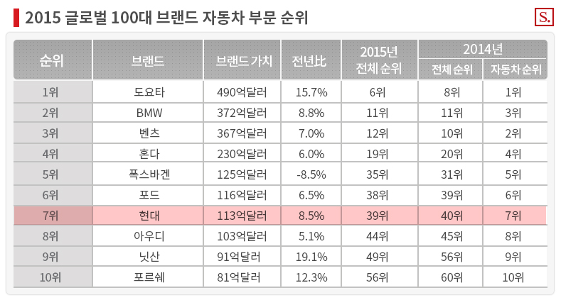 113억 달러로 작년보다 1계단 올라...자동차 브랜드 중 7위