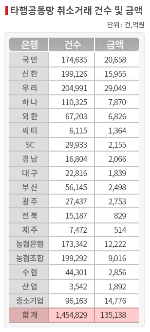 은행별 건수를 보면 우리은행이 20만4991건으로 가장 많았다. 그 뒤를 농협조합(19만9292건), 신한은행(19만9126건), KB국민은행(17만4635건), 농협은행(17만3342건) 등이 이었다.