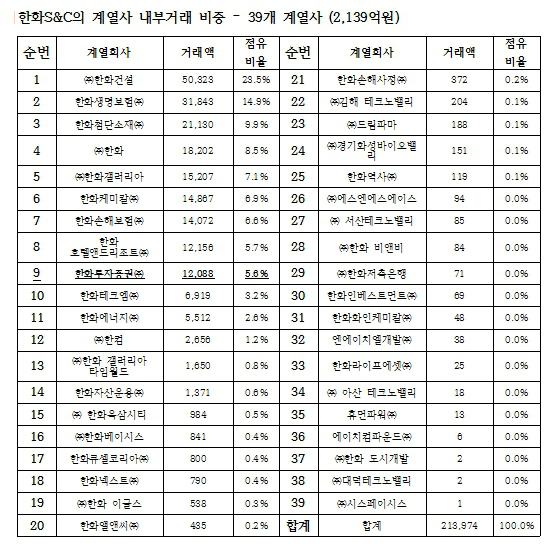 한화투자증권 내부거래 비중은 전체의 5.6%(121억원)에 불과하다. 나머지 한화그룹 계열사 37개와 내부거래 94.4%(2018억원)는 아직 밝혀지지 않았다.