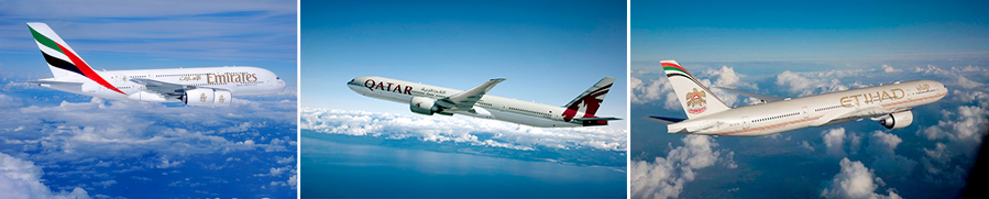 에미레이트항공·에티하드항공·카타르항공 등 중동을 대표하는 3개 항공사의 약진이 두드러지고 있다. 에미레이트항공은 거점 공항인 아랍에미리트 두바이공항을 이용해 환승객을 흡수하고 있다.