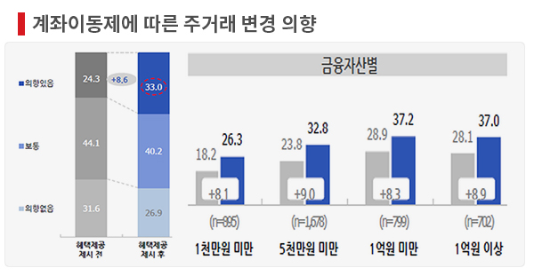 이번 조사에서 평균 33%가 혜택이 따를 경우 주거래은행을 바꿀 수 있다고 했다. 그런데 금융자산 1000만원 미만 보유자는 26.3%만이 혜택이 따를 경우 주거래 은행을 바꿀 의향이 있다고 했다. 대조적으로 5000만원 미만 금융자산 보유자는 32.8%, 1억원 이상 금융자산 보유자는 37%가 주거래은행을 바끌 것이라고 밝혔다.