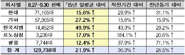 특히 지난 8월 27일 개별소비세 인하 후 9월 30일까지 35일간 국내 5개 주요 완성차 업체의 일평균 내수 판매는 21.9% 증가한 것으로 나타났다.